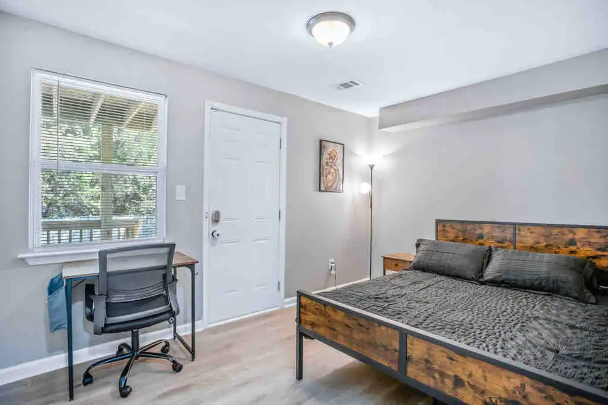 Shared room #6 features hardwood floors, 32in Smart Roku TV in the bedroom with a closet, mirror, dresser & night stand. Room also has a deck and PRIVATE ENTRANCE from the back lower patio.